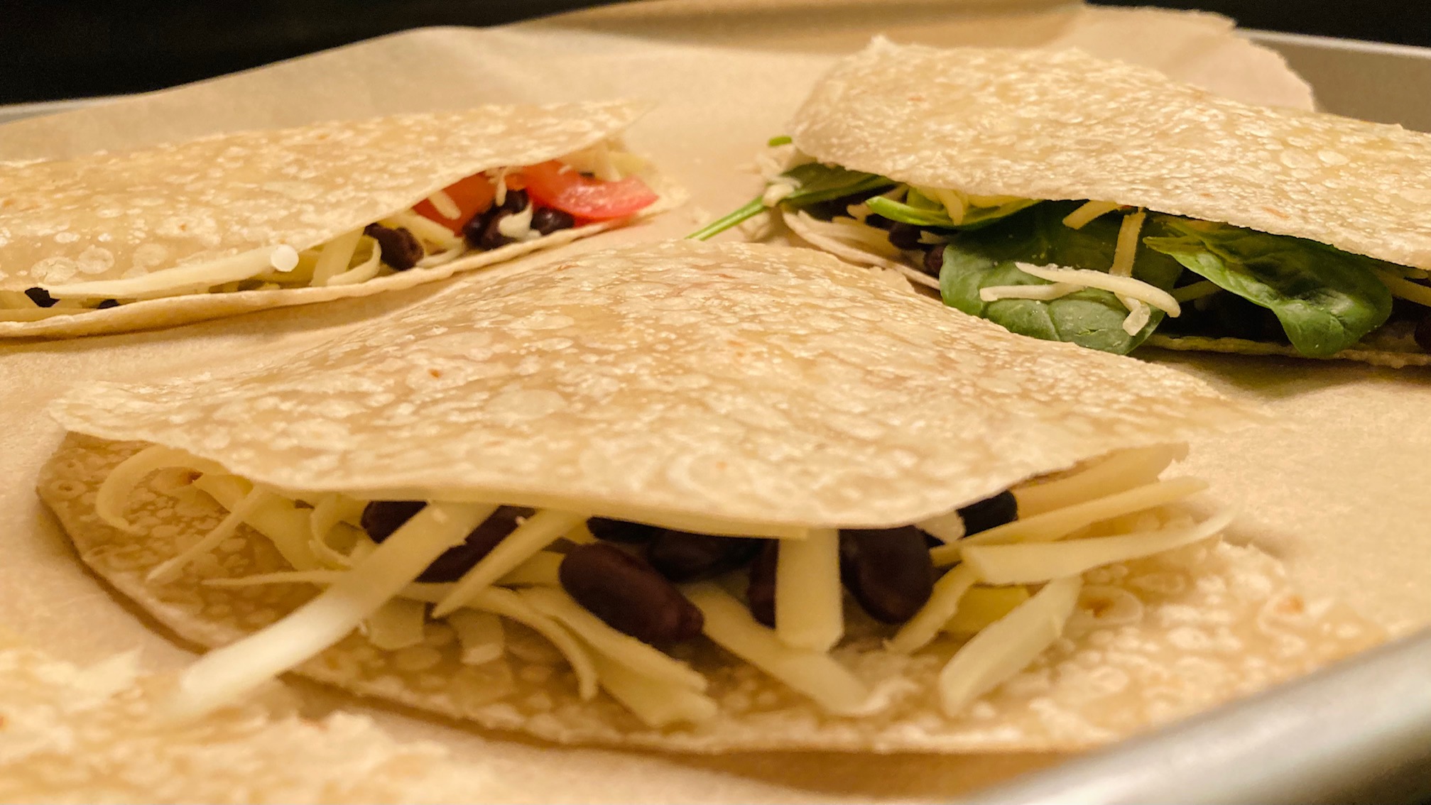 - Place bottom tortilla halves on prepared sheet pan. Spread ¼ cup black beans on each tortilla and then sprinkle with 1 ounce shredded cheese. Top with remaining tortilla halves.
