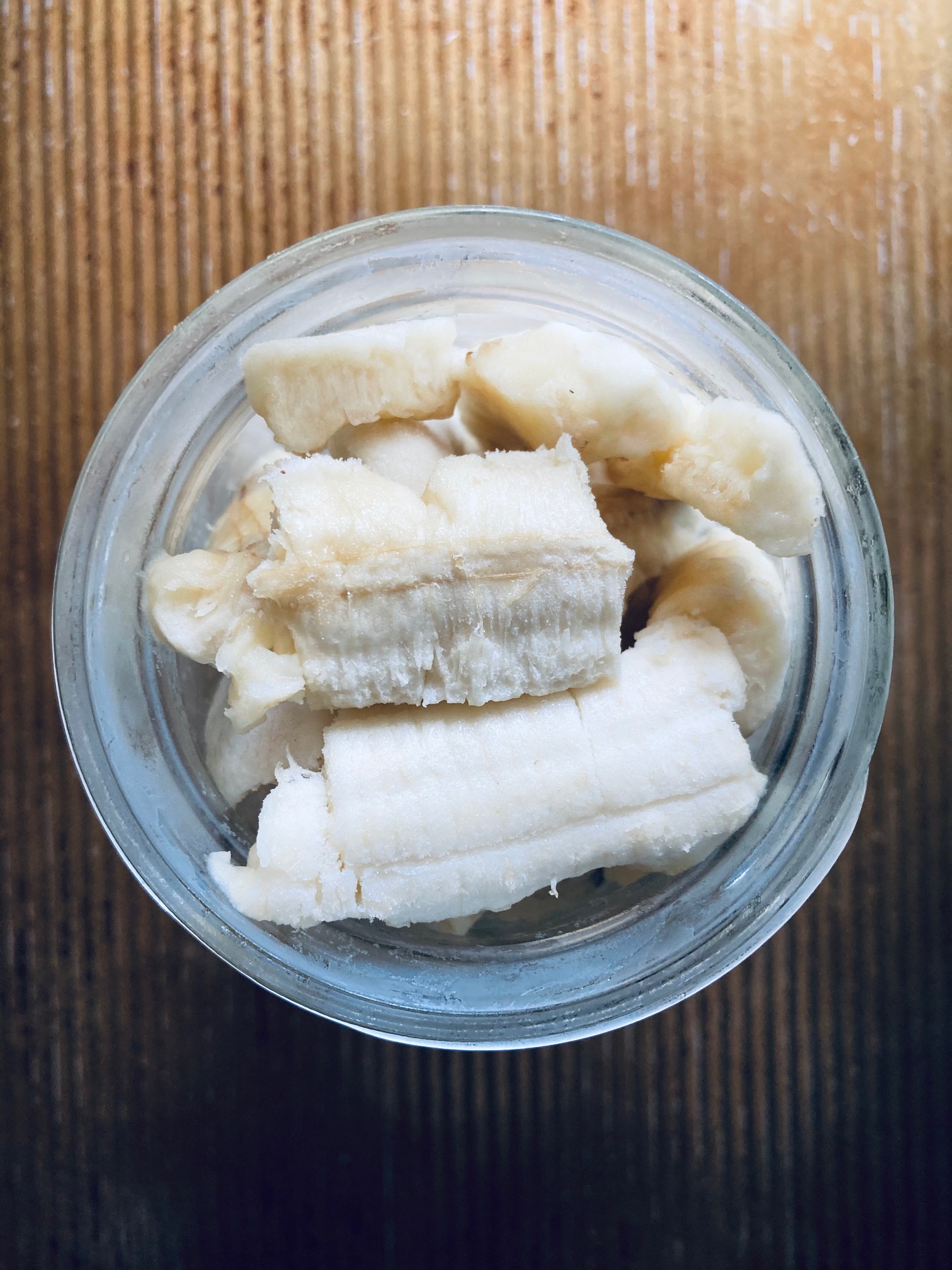 The best container to use for frozen bananas is freezer-safe glass with an airtight lid. The frozen banana strips store well vertically in a mason jar or laying flat in a rectangular storage container.