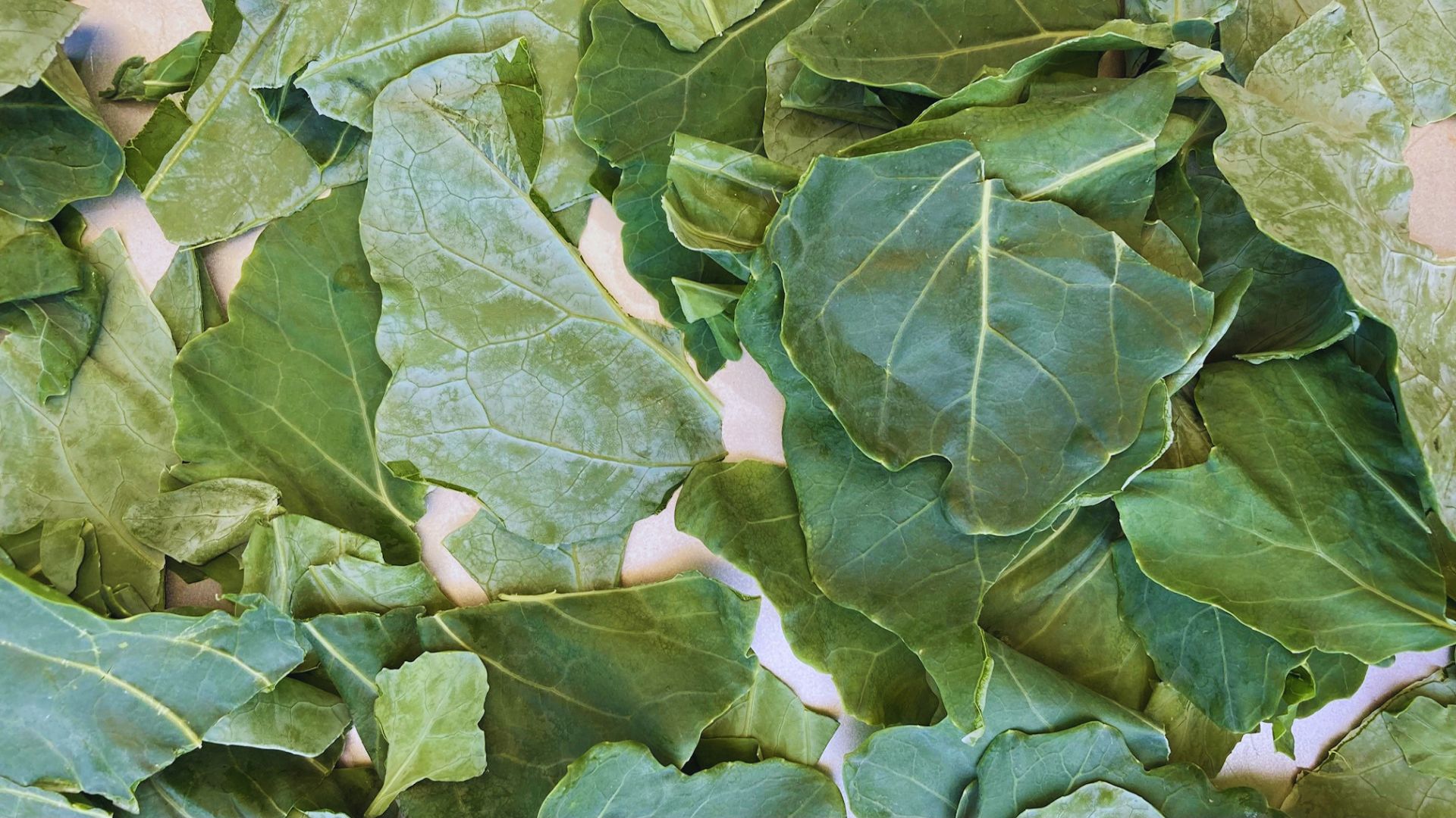 Spread the leaves over 1 or 2 sheet pans. For best results, try not to let the kohlrabi leaves overlap. If the pan is overcrowded they’ll steam instead of drying out like they should.